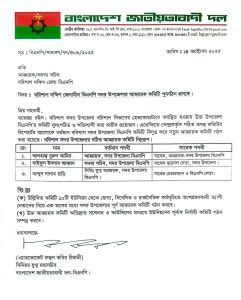 কেন্দ্রীয় দপ্তর থেকে প্রেরিত ওই চিঠিতে নতুন আহ্বায়ক কমিটির নাম ঘোষণা করা হয়। এতে আলহাজ্ব নুরুল আমিনকে আহ্বায়ক, সাইফুল ইসলাম আরমানকে সদস্য সচিব ও আব্দুস সালাম রাড়িকে সিনিয়র যুগ্ম আহবায়ক করা হয়েছে। চিঠিতে আরও বলা হয়েছে, ইউনিয়ন পর্যায়ের যোগ্য, নির্ভরযোগ্য ও ত্যাগী নেতাদের নিয়ে দ্রুত সময়ের মধ্যে সদর উপজেলা বিএনপির পূর্ণ আহ্বায়ক কমিটি গঠন করতে হবে। পাশাপাশি ইউনিয়ন কমিটির পূর্ণাঙ্গ কাঠামো গড়ে তুলে সাংগঠনিক কার্যক্রমকে আরও গতিশীল করার নির্দেশও দেওয়া হয়েছে।