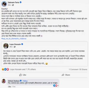 বাংলাদেশ টেলিভিশনের তালিকাভুক্ত কণ্ঠশিল্পী লোপা হোসাইনের ভেরিফায়েড ফেসবুক একাউন্টে দেওয়া একটি পোস্ট শেয়ার করে কথাগুলো লিখেছেন শবনম ফারিয়া। লোপা হোসাইন ওই পোস্টে লিখেন, ‘সহ্য করতে না পেরে ডিভোর্স দিলে কতনা গালি খেত এলমা মেয়েটা। সহ্য করতে করতে মরে গেল বলেইনা এখন আমরা মায়াকান্না কাঁদছি…