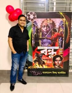 বাবার চলচ্চিত্রের পোস্টারের সামনে নির্মাতা দেবাশীষ বিশ্বাস